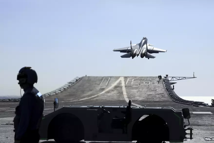 新華社通信が2021年12月31日に公開した日付不明の写真。黄海から東海、西太平洋にかけての海域で行われた公海戦闘訓練中、中国海軍の遼寧空母から艦載戦闘機J-15が離陸する様子。(胡山民/新華社=AP通信)
