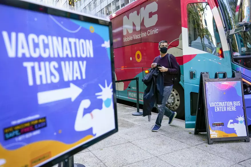 2021年12月6日、マンハッタン中心部の移動ワクチン接種会場で、男性がワクチン接種バスから降りる。(AP通信/メアリー・アルタファー撮影)