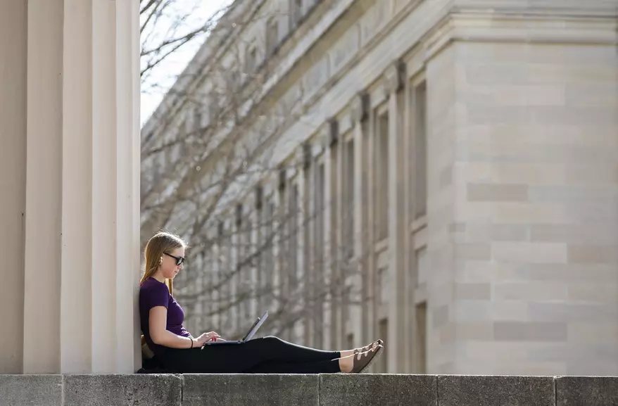 2024年2月25日(日)、アイオワ州アイオワシティにあるアイオワ大学キャンパスで、学生が日差しを浴びながら宿題に取り組んでいる。ウィチタ州立大学、アイオワ大学、カリフォルニア大学サンタクルーズ校は昨年、女性学プログラムを廃止した。これは教育省が人種に基づく教育やトランスジェンダー教育を提供する学校への連邦資金提供を打ち切る可能性を示唆した後の動きである。